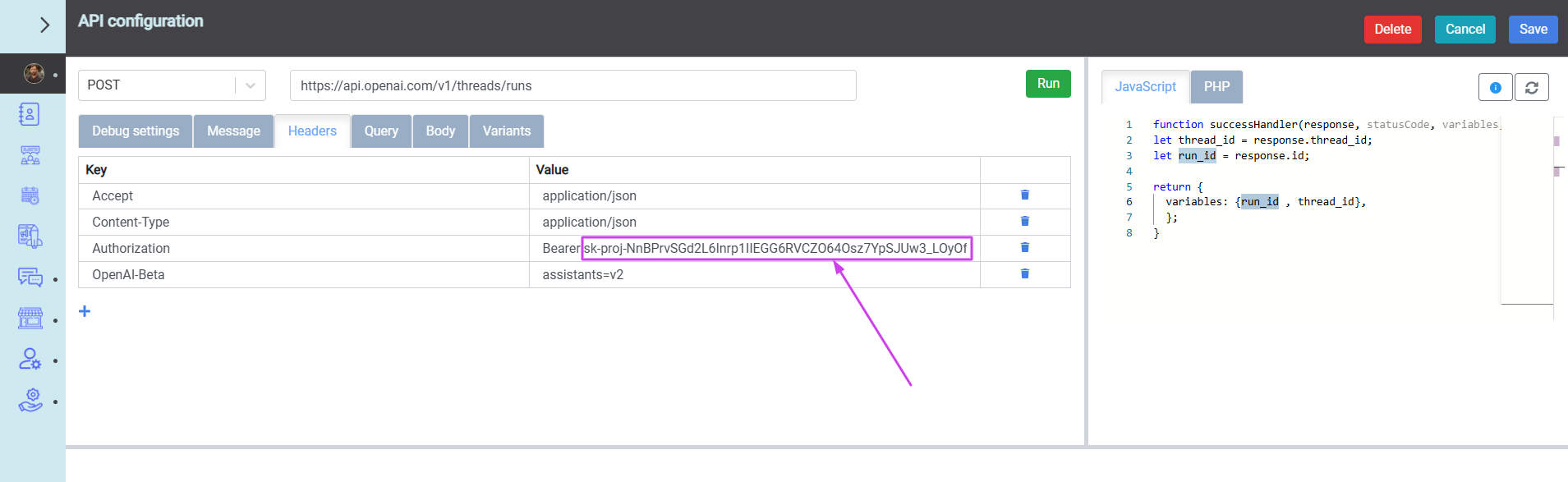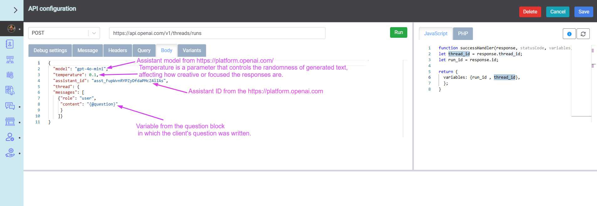 A kérés tartalmában meg kell adni a kiválasztott modellt, a temperature és az assistant_id paramétereket.