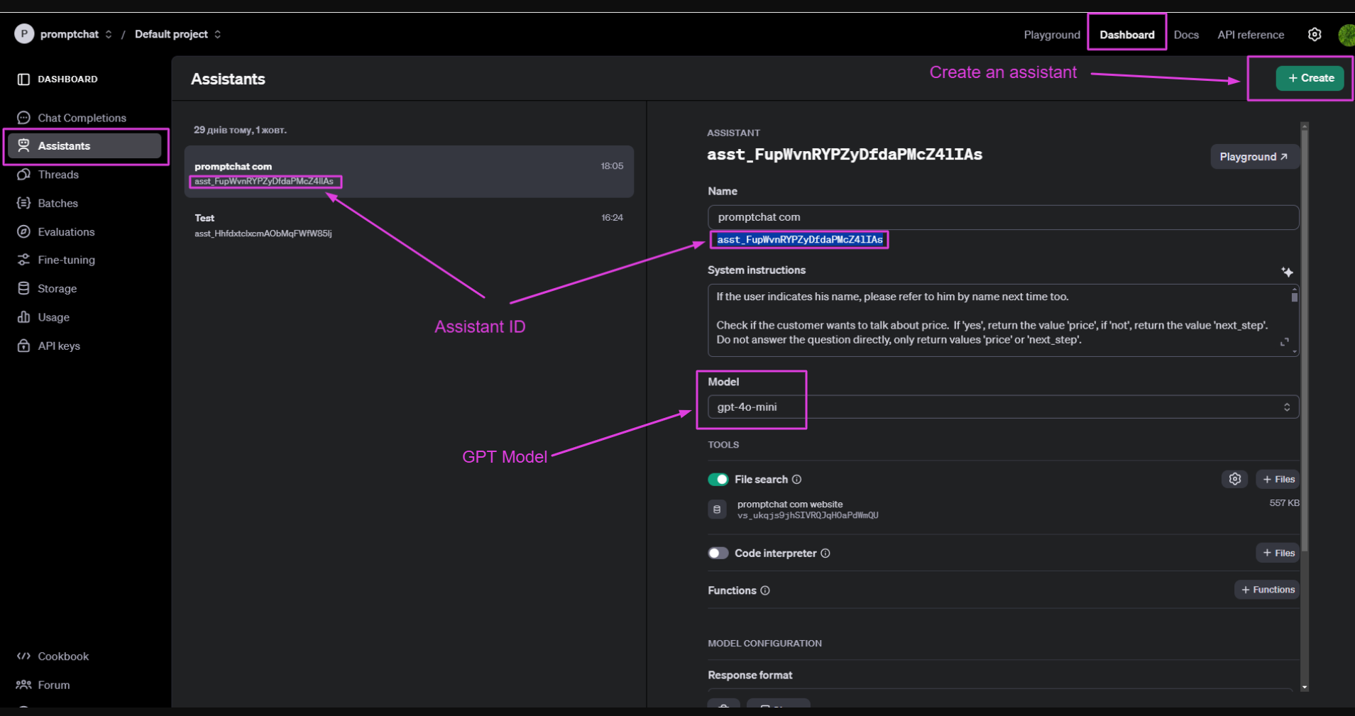 Ezután létre kell hozni az AI asszisztenst, annak azonosítójára a későbbiekben szükségünk lesz. Majd ki kell választani a használni kívánt GPT modellt.