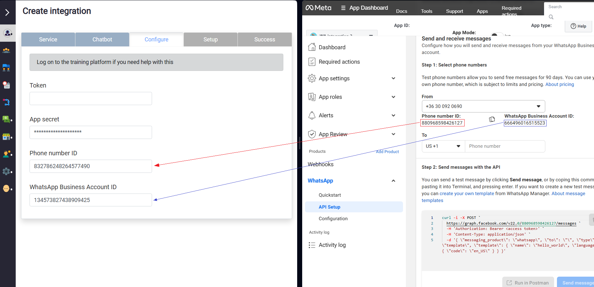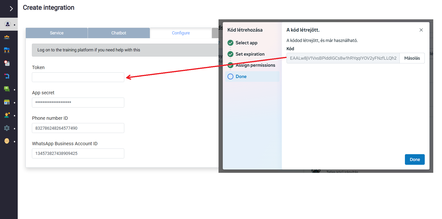 • Mentés után, keresse fel a Facebook Developers felületének "WhatsApp" főmenüpont, "Configuration" almenüjét, majd másolja be a kért adatokat az integrációs felület "Setup" részéből.