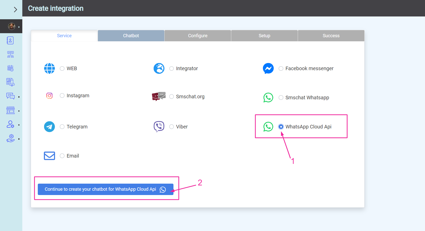 • Válassza ki a megnyíló lehetőségek közül a WhatsApp Cloud API lehetőséget