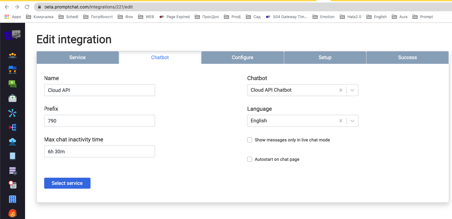 • Válassza az "Chats" főmenüpont alatt a "Integrations" menüpontot