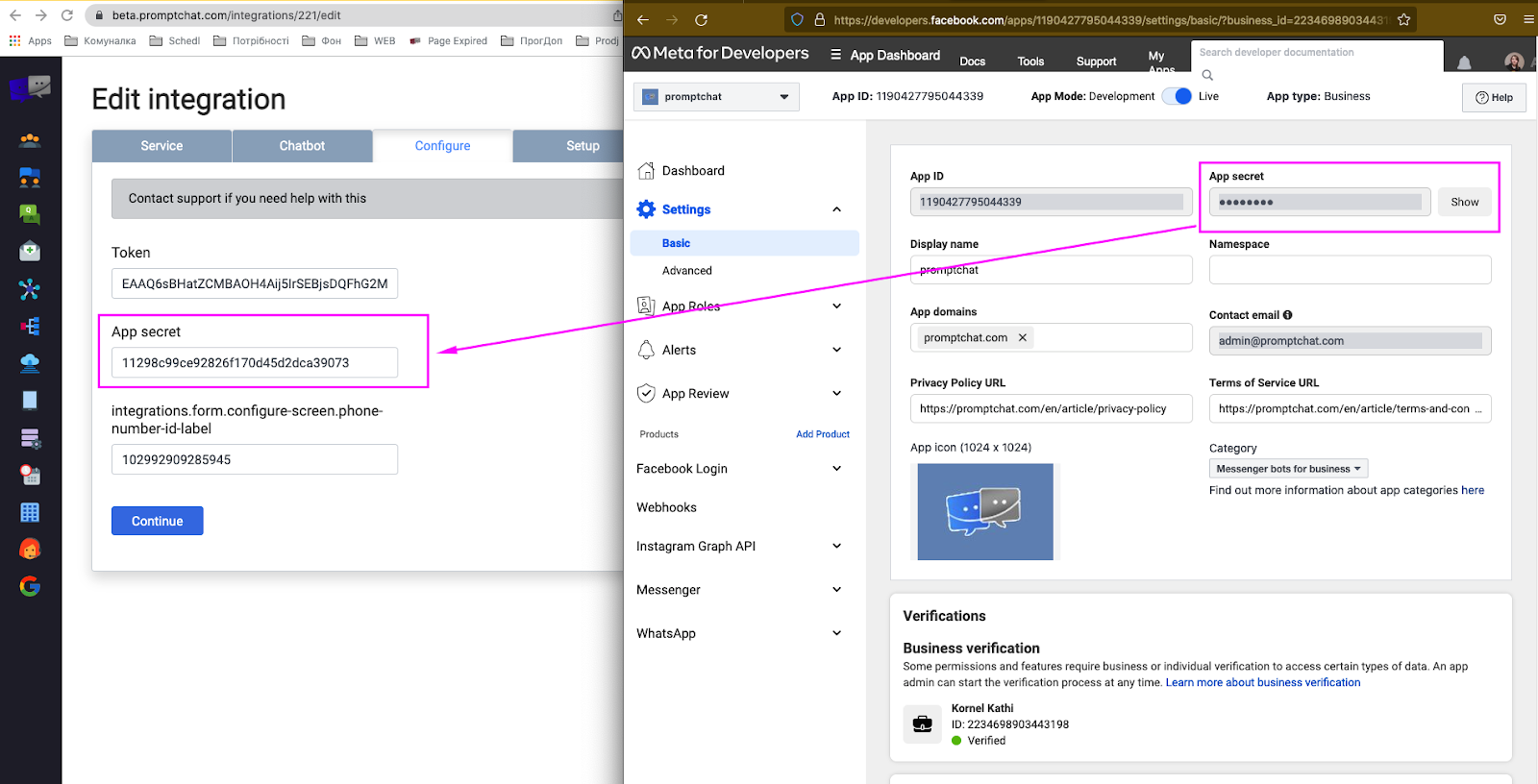 Business Account azonosító és Phone number azonosítók beállítása